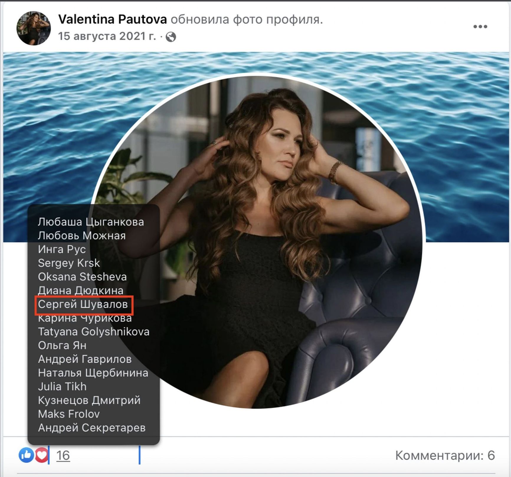 A certain Sergey Shuvalov likes Valentina's photos.