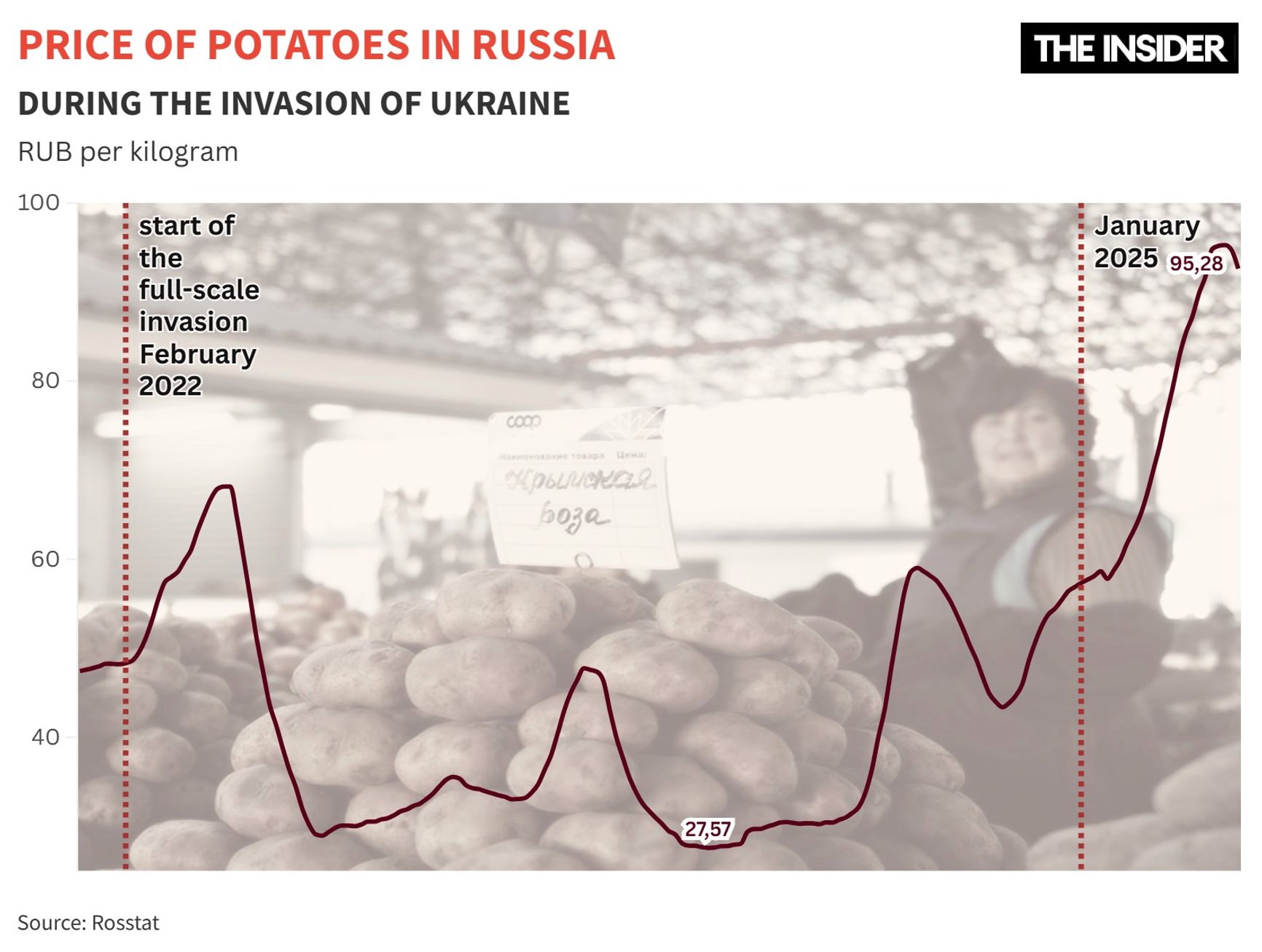 A source with knowledge of the situation — an economist who spoke to The Insider on condition of anonymity — says that potato prices may decrease in the fall, albeit temporarily. The arrival of the new harvest will help, and the authorities may also intervene in order to regulate prices, artificially bringing them down to between 60 and 100 rubles per kilogram.