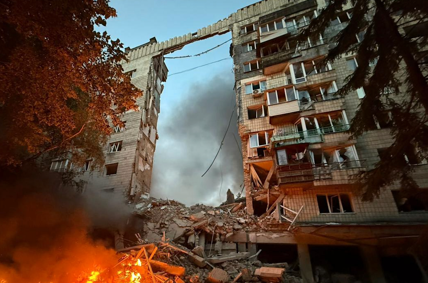 The Solomianskyi and Darnytskyi districts of Kyiv suffered the most significant damage. In Solomianskyi, emergency crews continued clearing debris from the destroyed section of the nine-story building where the fatalities occurred. Rescuers managed to free people trapped in stairwells, apartments, and beneath the rubble. Among the damaged sites was a student dormitory belonging to the Kyiv Aviation Institute. It was struck by debris from an intercepted aerial target. Another high-rise residential building also caught fire after being hit.