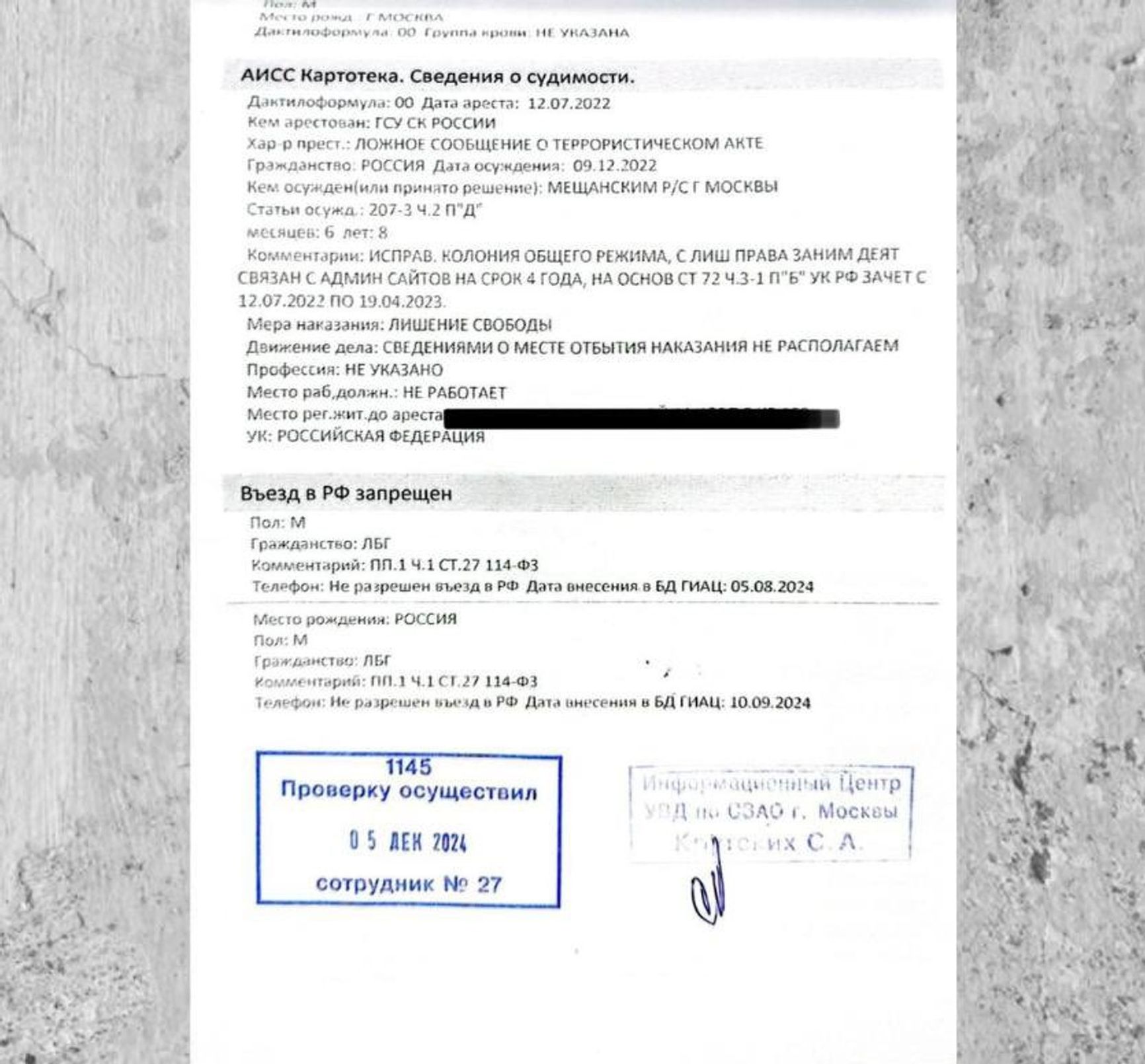 “To be honest, there’s little trust in this document. Most likely, the Interior Ministry has once again made a mix-up. The document states [in the ‘Criminal Record Information’ section] that ‘the nature of the crime is a false report of a terrorist act’ [whereas Yashin was actually convicted for spreading ‘fakes’ about the Russian Armed Forces]. A similar situation could be the case with his stateless person status.