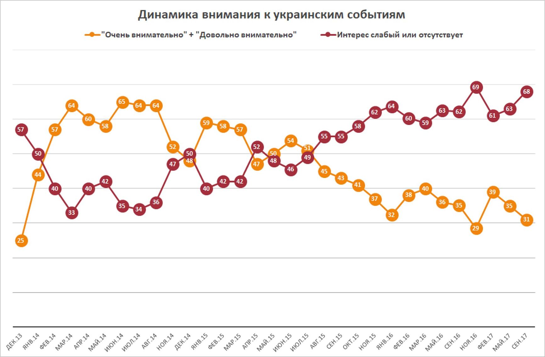 Public engagement with events in Ukraine: “Paying close attention” + “Paying some attention” (orange) / Low interest or no interest (red)