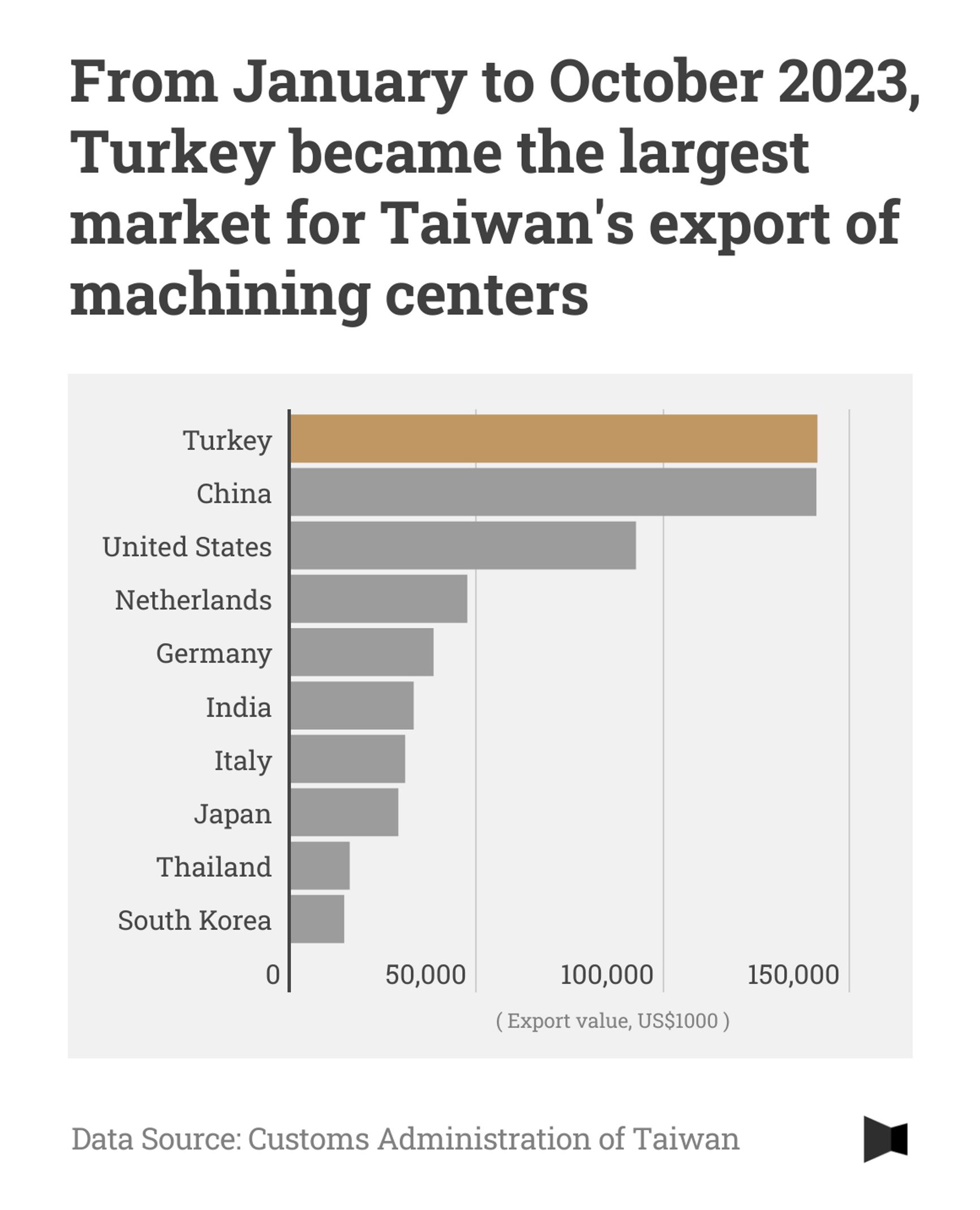 Taiwanese customs statistics also reflect the fact that Turkey has been serving as a transit point for the island’s exported machine tools. The total value of Taiwan's machining exports to Turkey between January and October 2023 showed a 45% increase over that of the same period in 2022. This jump suddenly made Turkey the leading export market for Taiwan’s machine tools makers — officially at least.