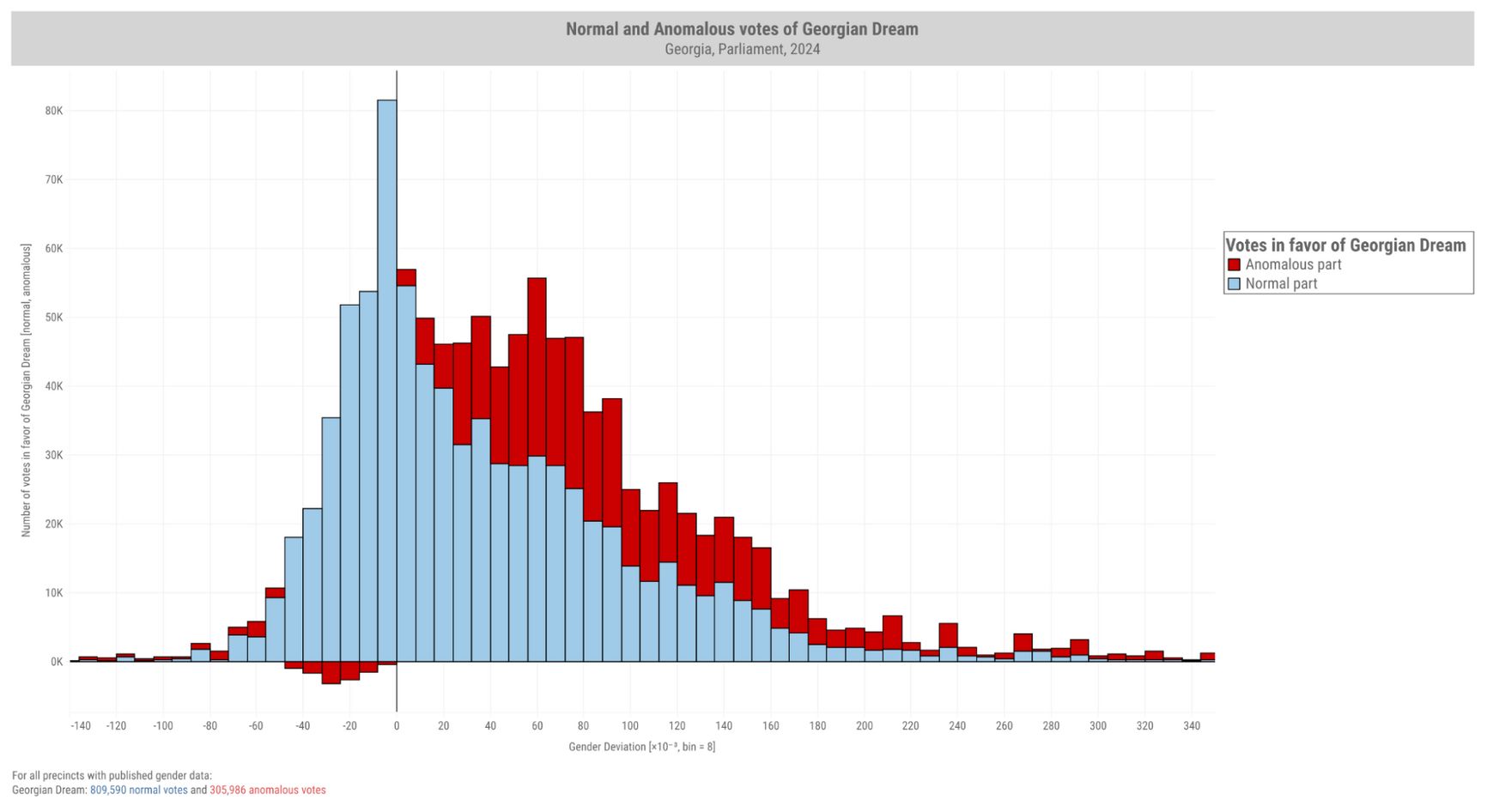 On the graph, the horizontal axis represents gender deviation (divided into bins of eight), while the vertical axis shows votes for Georgian Dream per bin. Blue bars indicate “normal” votes, while the red bars represent “anomalous” votes.