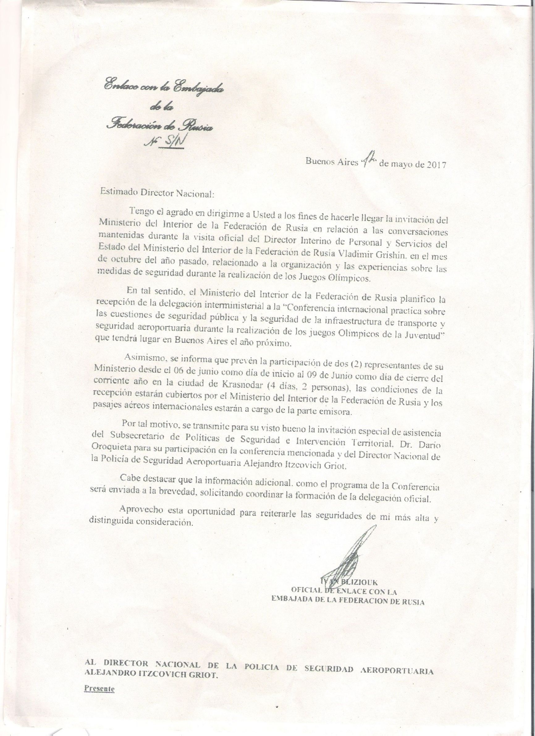 Помимо дипломатов, Близнюк и Ковальчук пытались заручиться поддержкой полиции, отвечающей за безопасность аэропортов (в Аргентине это отдельная служба). 22 мая 2017 года Близнюк написал письмо в адрес начальника полиции безопасности аэропортов Аргентины Алехандро Гриота и пригласил его в Россию, снова подписавшись «представителем по связям с посольством России».