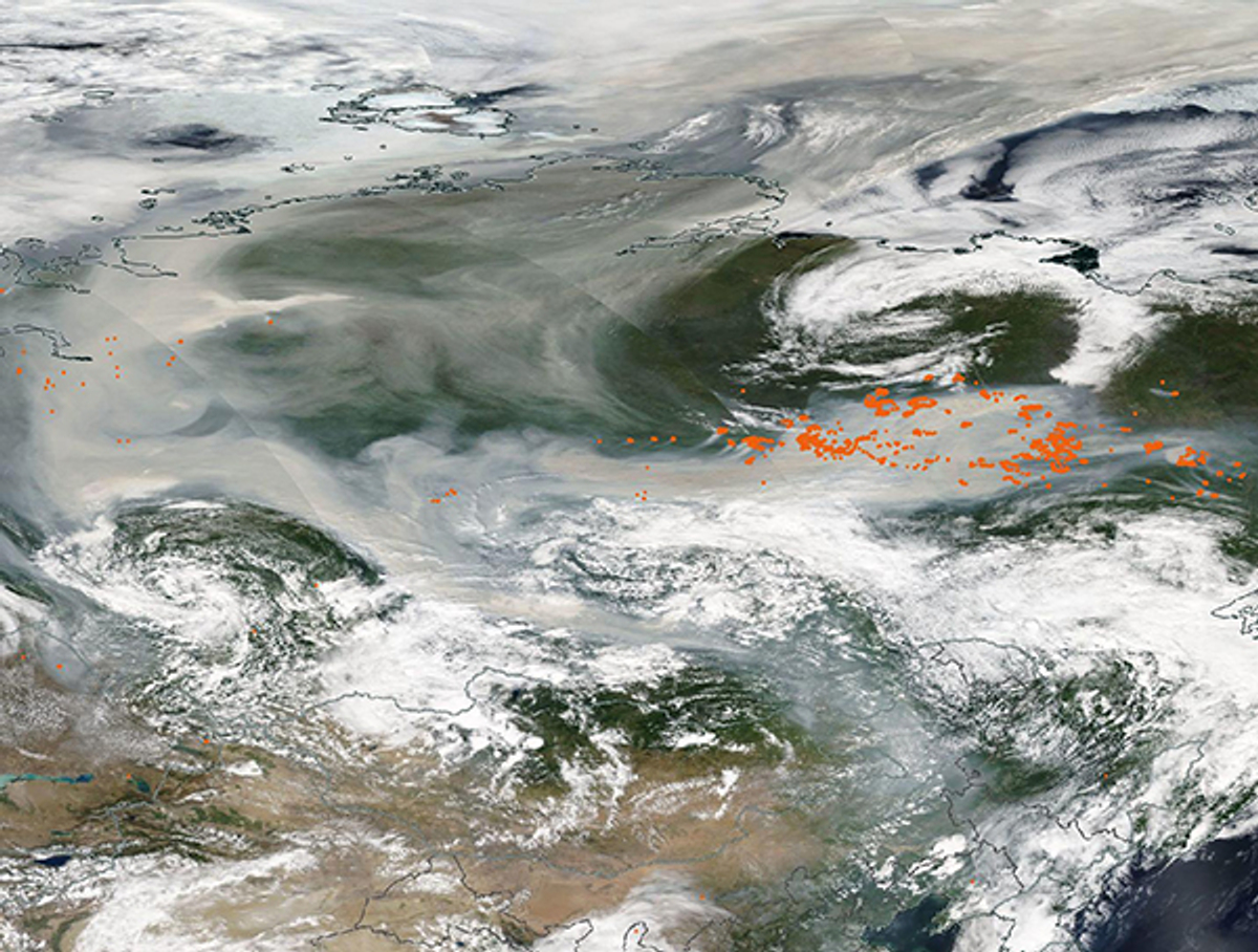 «Дым настолько густой, что большая часть земли внизу скрыта из виду. Он простирается примерно на 3200 км с востока на запад и на 4000 км с юга на север, но он охватывает только небольшую часть дыма от пожаров в России. На этой неделе дым от лесных пожаров прошел более 3000 км от Якутии, чтобы достичь Северного полюса, что, по-видимому, является первым зарегистрированным случаем в истории», — сообщается на сайте MODIS.