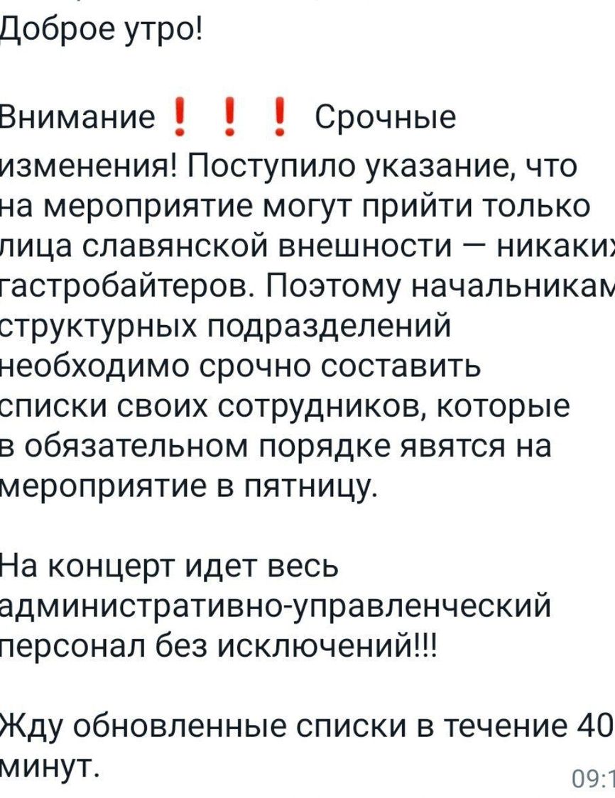 В этих распоряжениях говорится, что участникам необходимо избегать в одежде желто-синих цветов, а для массовки надо привлекать «только людей славянской внешности».