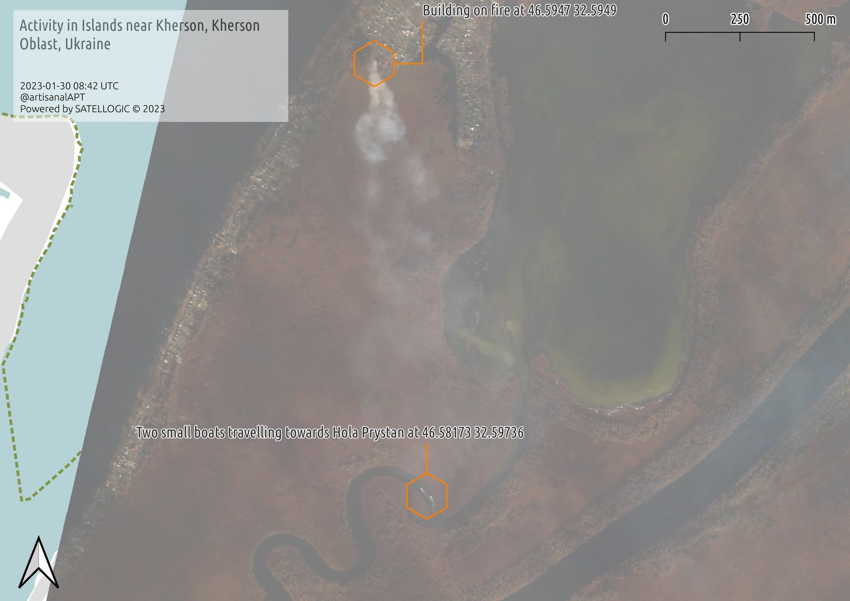 OSINT-аналитик Тим Эрхарт на своей странице в Twitter заявил, что недалеко от Херсона сегодня был виден огонь, а также две лодки, которые на большой скорости уходили в сторону Голой Пристани. Он указал координаты и предположил, что кто-то мог пострадать.