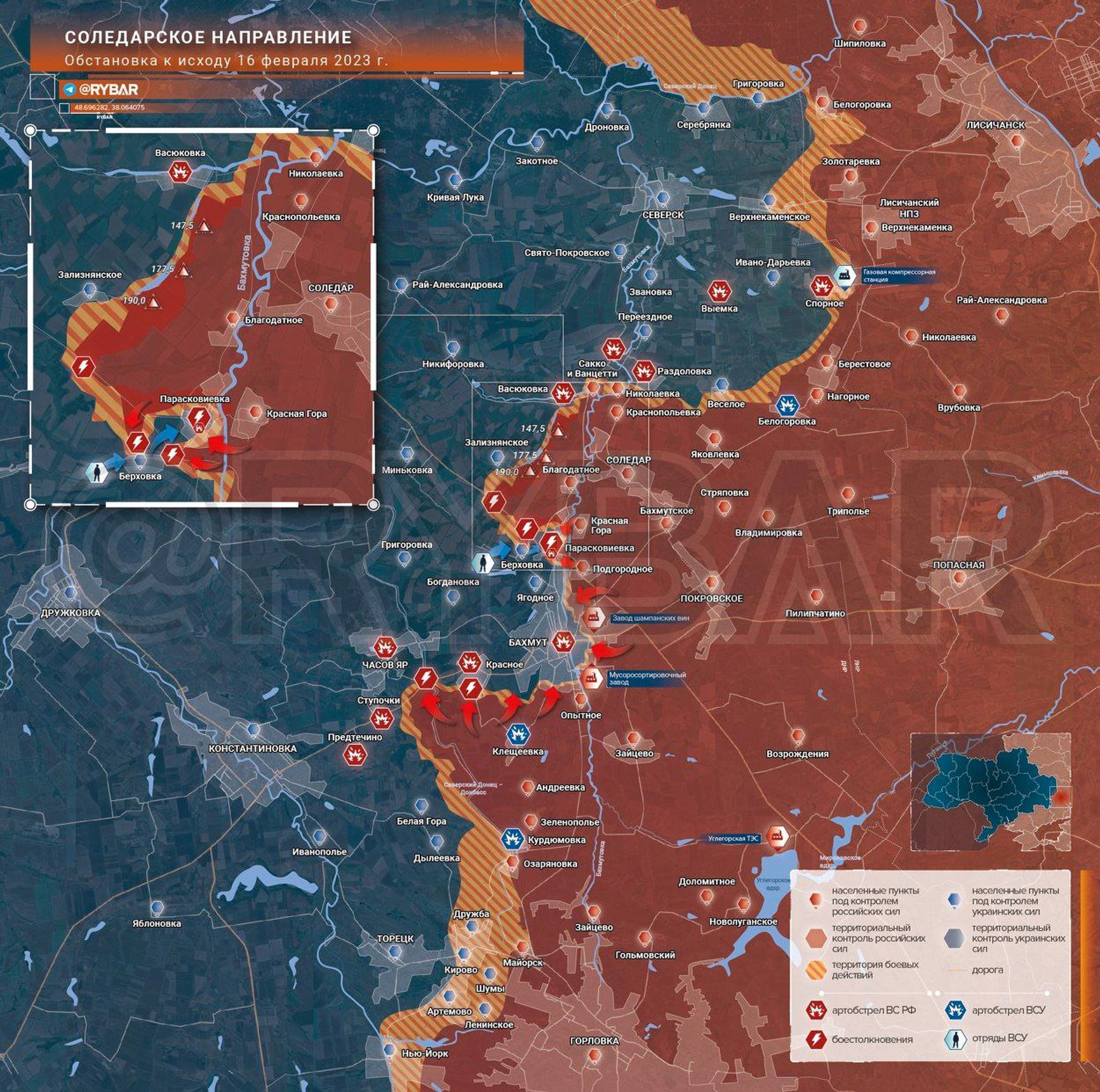 В районе Угледара, где в последние дни шли ожесточенные бои, ситуация остается стабильной. Несмотря на потери, Россия продолжает давление, наступающие группы пехоты прикрываются огнем танков и артиллерии, сообщает аккаунт Tatarigami UA, который ведет офицер ВСУ в запасе. По его словам, бронетехника используется для прикрытия, доставки и эвакуации пехоты, также используются танки с закрытых позиций. Как заявил в разговоре с The Insider военный эксперт Роман Свитан, в районе дач под Угледаром сейчас такая же ситуация, как и в Парасковиевке Бахмутского района. Там есть участок, куда войска РФ пытаются подойти, однако Угледар находится на холме, а все, что южнее, восточнее и западнее — низина, поэтому украинская артиллерия, которая стоит на холме, очень хорошо отрабатывает на любым частям. Российские паблики начинают рассказывать про окружение украинских войск, хотя как такового окружения там не может быть потому что их там толком нет, отмечает эксперт. «В основном мы держим рубеж на дистанции артиллерийского обстрела. Мы подвозим припасы и батареи по этим выходам россиян бьют», — заявил Свитан.