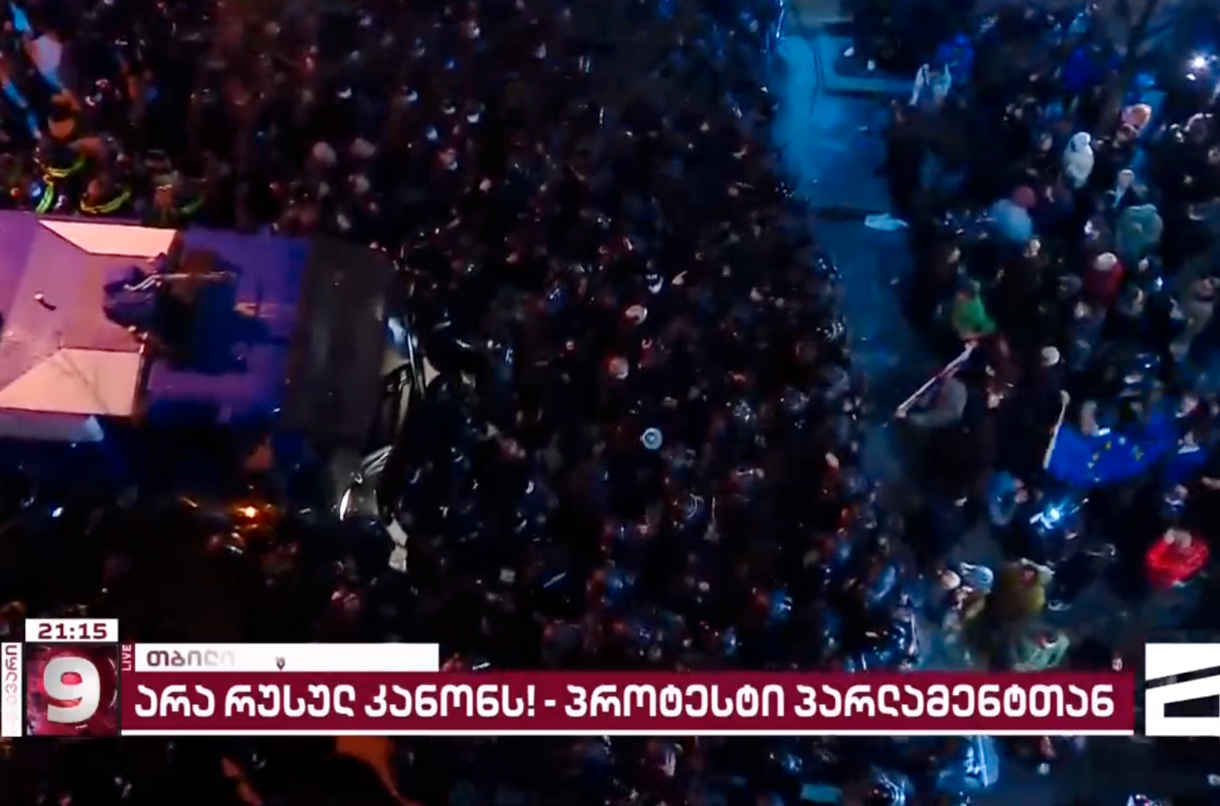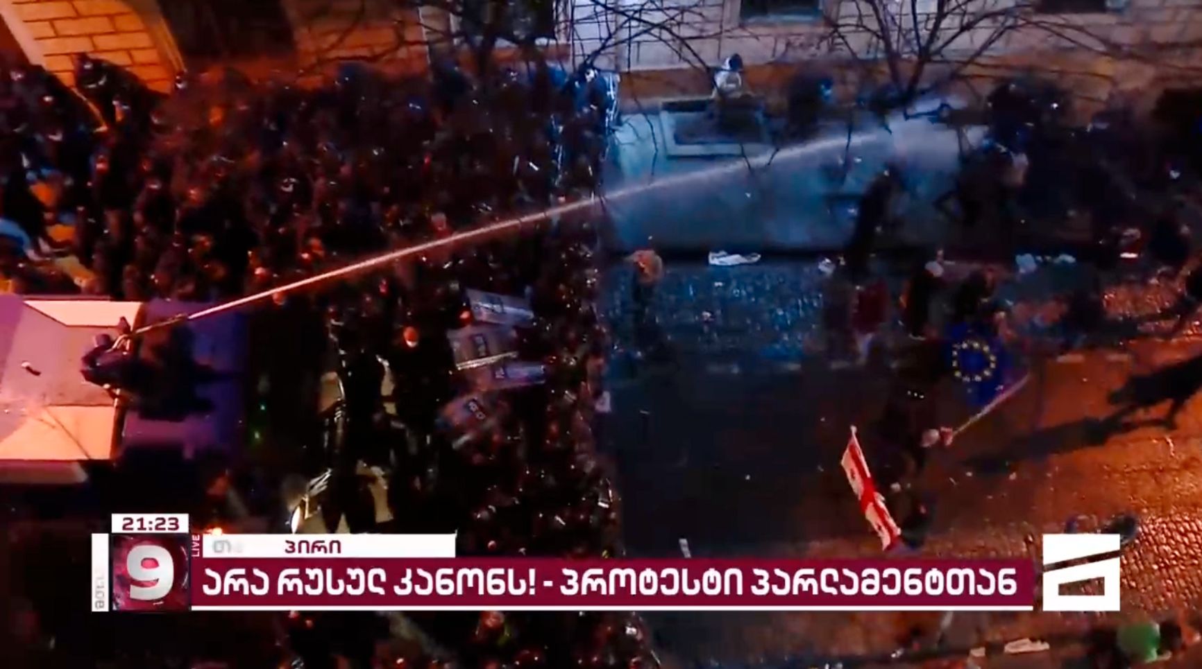На проспекте Руставели у здания парламента Грузии продолжается масштабный митинг против законов об «иноагентстве». Полиция начала применять слезоточивый газ, его распыляют из баллонов в толпу митингующих. Также на место прибыли водометы. Трансляцию ведет телеканал Mtavari. Корреспондент канала была вынуждена прервать свой репортаж, так как не могла нормально дышать и говорить из-за газа.