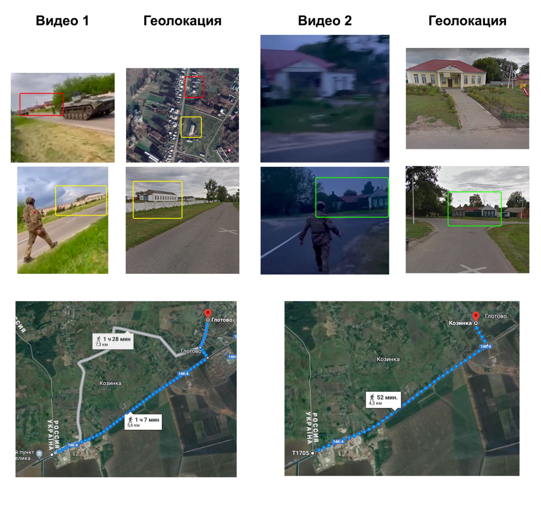 Местонахождение Лапина на этих видео оказалось несложно установить. Это село Глотово, где на тот момент не велось активных боевых действий — все они во время съемки уже проходили у КПП «Грайворон» на границе. Таким образом, генерал-полковник находился примерно в 5 км от места боев.