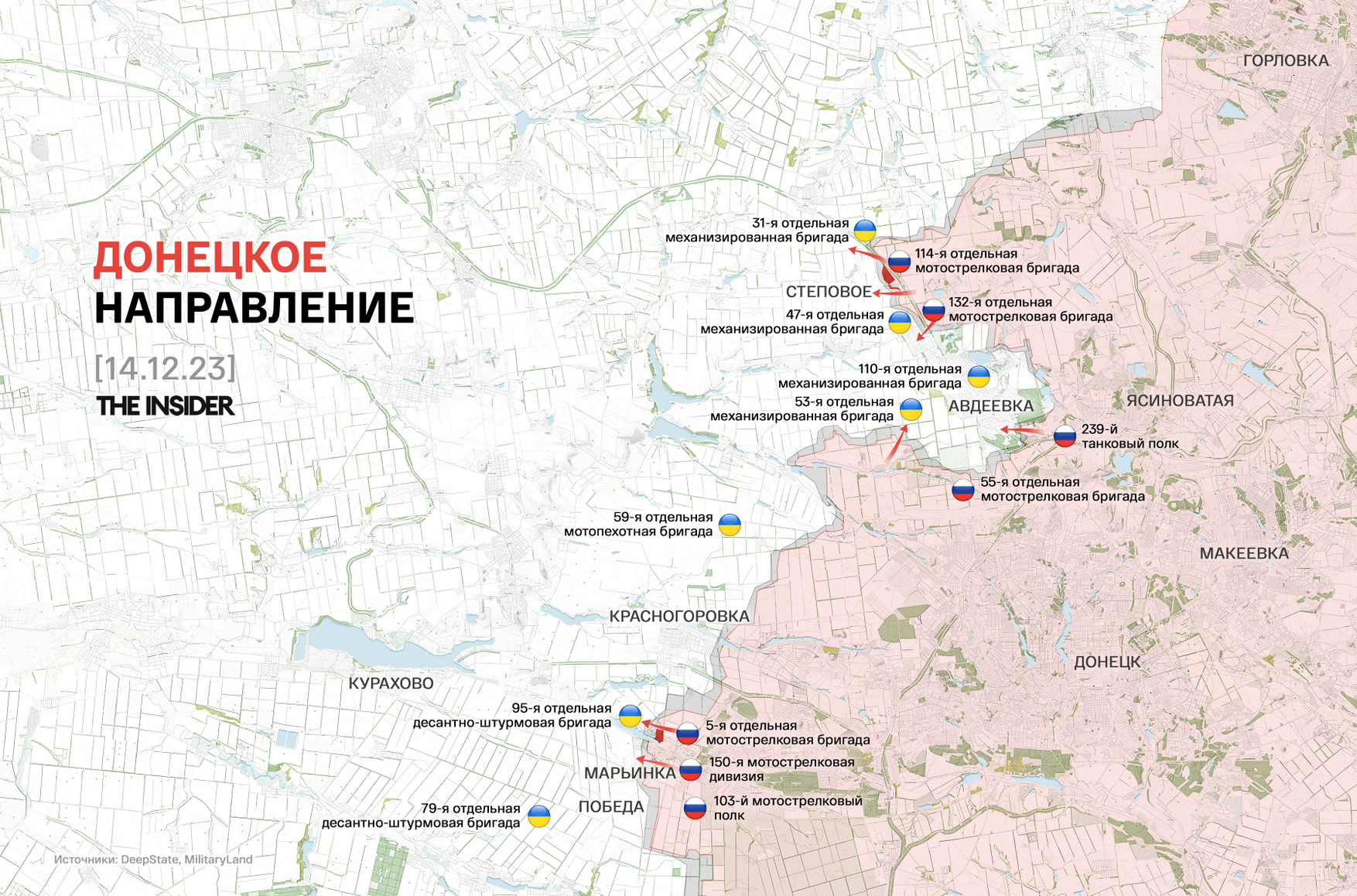 Между тем, DeepState сообщает, что 92% площади Марьинки занято российскими силами. По данным российского военного блогера Бориса Рожина, Марьинка взята целиком, за исключением участка на северо-западных окраинах города.