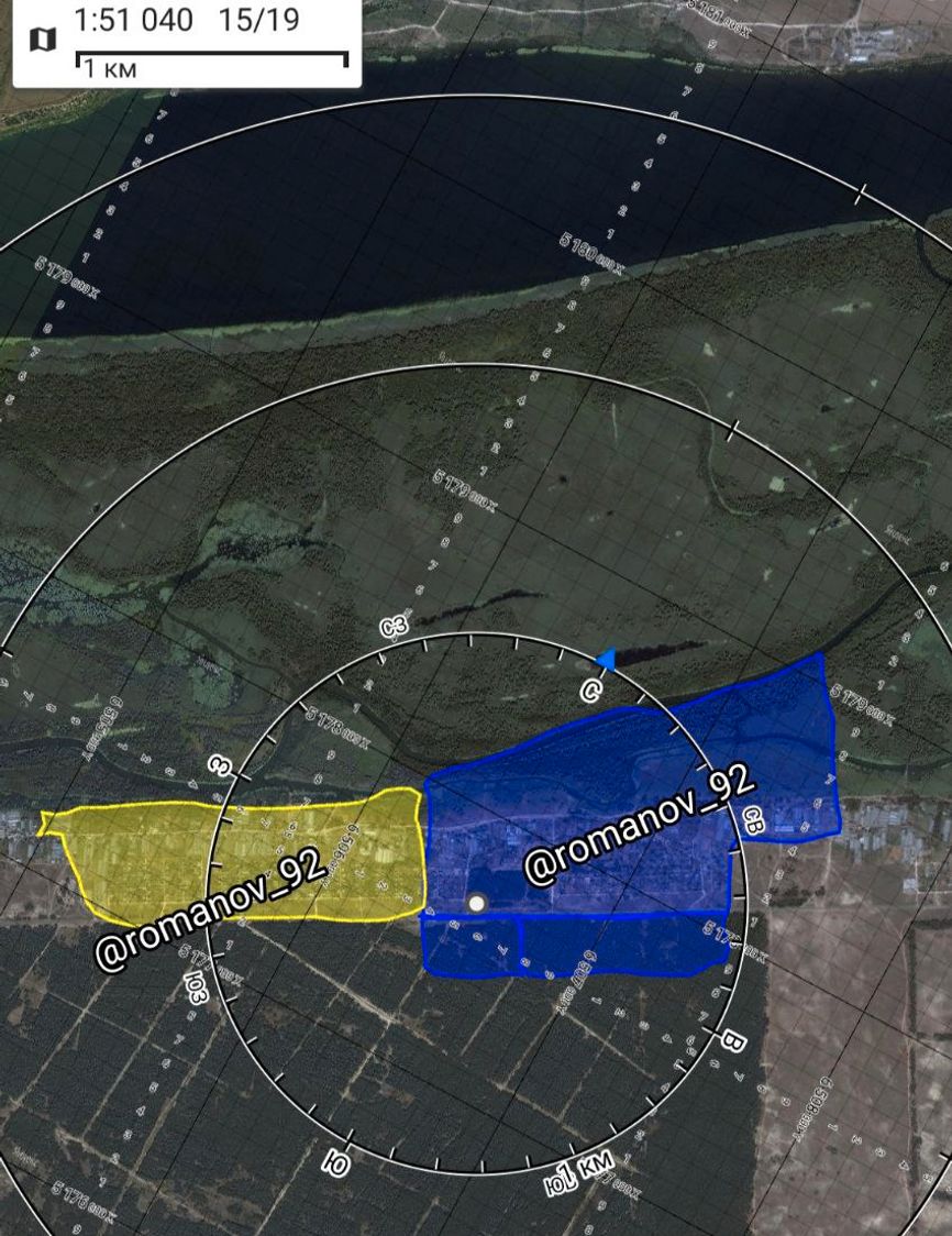 «Военкор» Владимир Романов показывает линию боевого соприкосновения на левом берегу Днепра в Крынках, ссылаясь на сообщения военных с фронта. Также на карте он указывает территорию на западе населенного пункта общей протяженностью в 1 км, занятую за последние 1,5 месяца бойцами ВСУ (отмечена желтым).