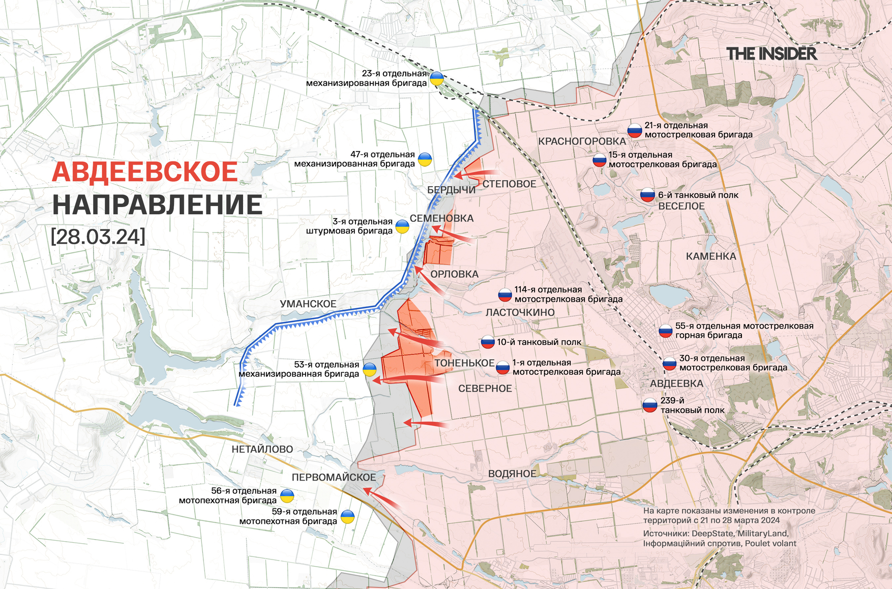 «Военкор» Юрий Котенок рассказывает о ситуации на донецком направлении. По его оценке, украинские войска упорно держатся за населенные пункты Новомихайловка и Победа южнее Марьинки и контратакуют в Семёновке на рубеже обороны западнее Авдеевки. Среди проблем ВС РФ на этом участке «военкор» называет «много грязи и лысые посадки» — то есть распутицу, мешающую передвижениям, а также отсутствие листвы на деревьях в лесополосах, что затрудняет их использование в качестве укрытий.