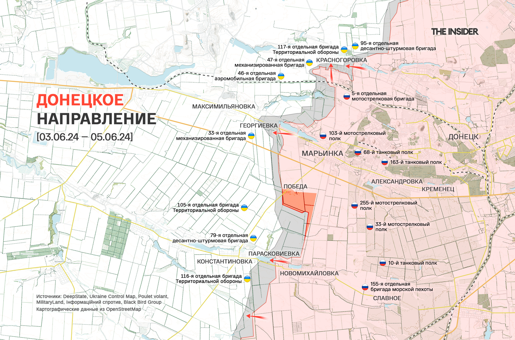 По его данным, российские войска выбили противника, но «пока не закрепились» в Парасковиевке и теперь ведут бои на окраинах лежащей западнее Константиновки, «полностью отбили» поселок Победа к югу от Марьинки, вышли к Карловке и «окружают» Яснобродовку в полосе наступления к западу от Авдеевки. В то же время Котенок отмечает «тяжеловатое» продвижение в Красногоровке (севернее Марьинки) и бои с «переменным успехом» в Соколе и Новоалександровке.