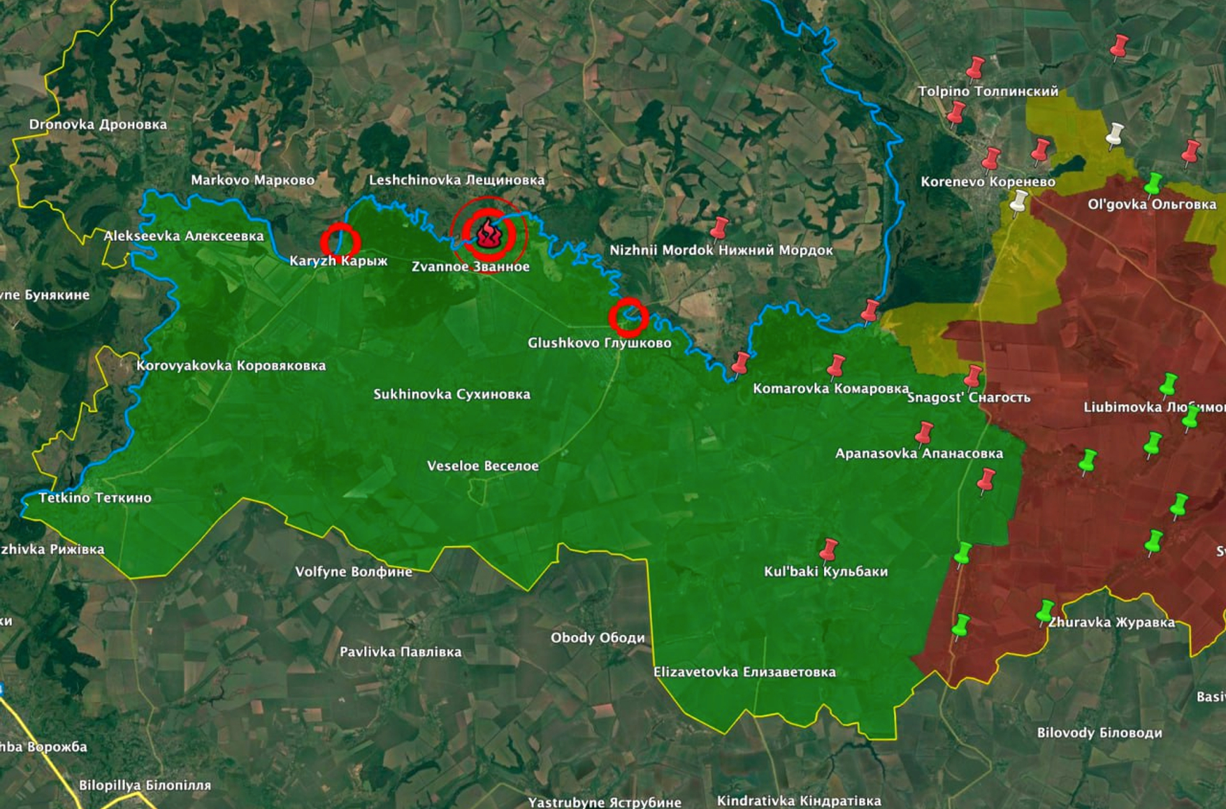 Всего в Глушковском районе действуют три моста через реку Сейм: рядом с населенными пунктами Глушково, Званное и Карыж. Удары по мостам, по всей видимости, означают подготовку к наступлению со стороны подразделений ВСУ, которые сейчас ведут бои восточнее по рубежу Внезапное — Снагость — Коренево.