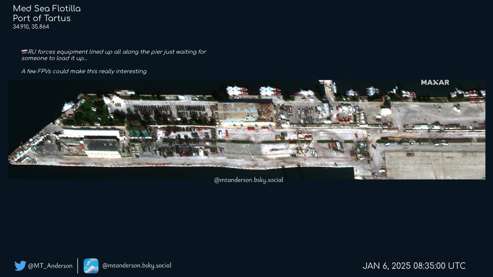 Судя по спутниковым снимкам от Maxar, которые публикуют Z-каналы, кроме «Спарты» у побережья Сирии находятся фрегат «Адмирал Головко», БДК «Иван Грен» и БДК «Александр Отраковский», однако данные военных кораблей не показываются на MarineTraffic. OSINT-аналитик, пишущий под ником MT Anderson, который часто публикует спутниковые снимки Maxar, отмечает, что на снимке от 6 января виден также российский БДК «Адмирал Григорович», на тот момент он был в 8 км от порта Тартус. Также на снимках видны техника и военный транспорт, собранный со всей Сирии, которые ожидают погрузки.