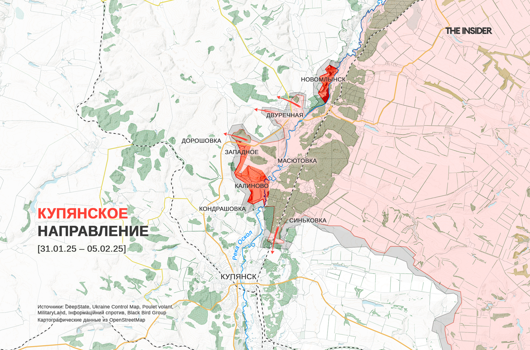 DeepState фиксирует продвижение ВС РФ около Западного и Кондрашовки севернее Купянска, а также в сторону Тополей рядом с российско-украинской границей. Аналитики проекта отмечают, что в районе Тополей на правом берегу реки Оскол создан небольшой плацдарм, и ВСУ предпринимают меры, чтобы не допустить его «разрастания» по примеру двух других плацдармов в Двуречной и Новомлынске.