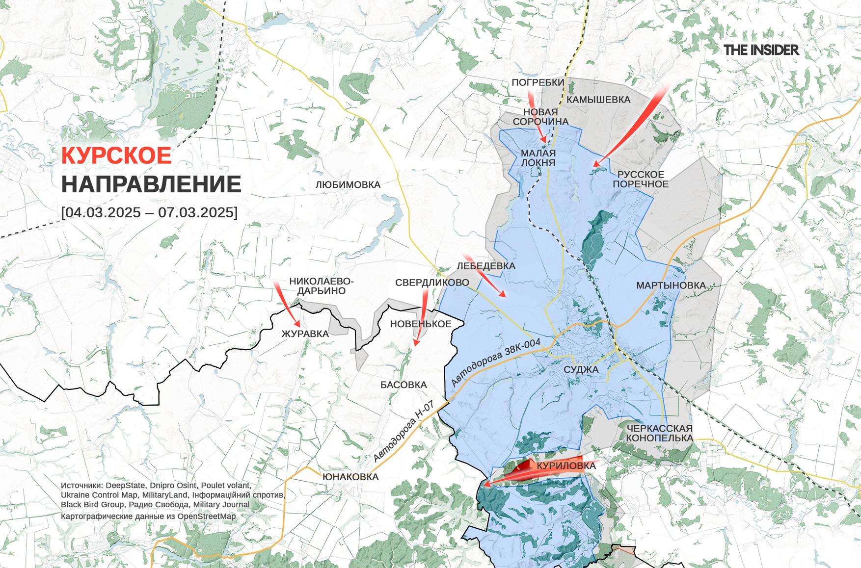 Между тем, появилось первое подтверждение присутствия ВС РФ в Сумской области — видео отражения атаки опубликовала украинская Госпогранслужба. Судя по геолокации DeepState, события разворачиваются к северо-западу от Басовки. Пророссийский OSINT-канал «Сливочный каприз» отмечает заход российских военных в Сумскую область на глубину до 1 км.
