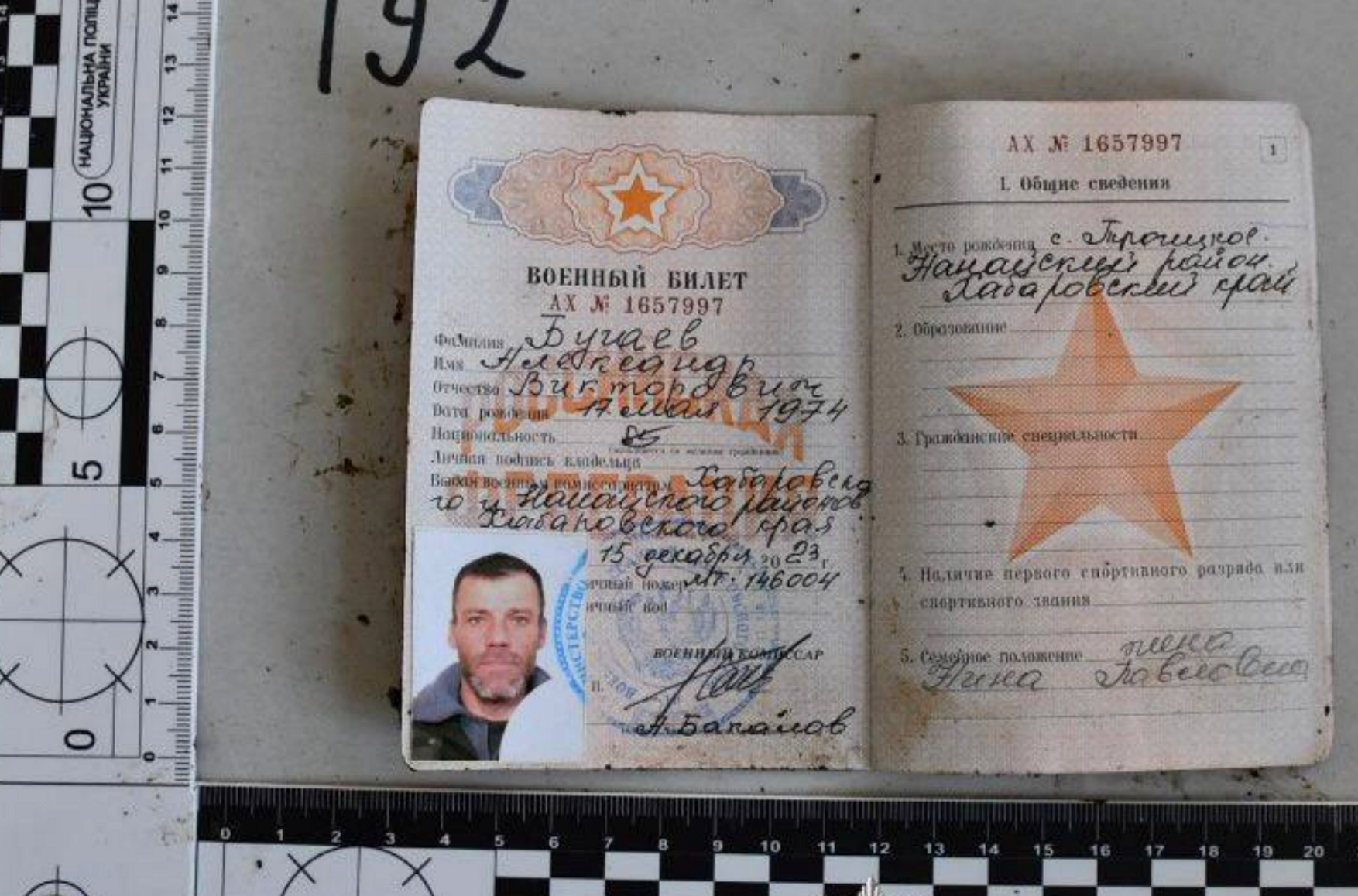 «Труп №192/25. Одет в форму образца вооруженных сил России. При нем — паспорт гражданина РФ, военный билет, талон аттестата военнослужащего № 1252, выписки из приказа командира в/ч № 52 от 26.12.2023, жетон с надписью: “ВС РОССИИ МТ-146004”»