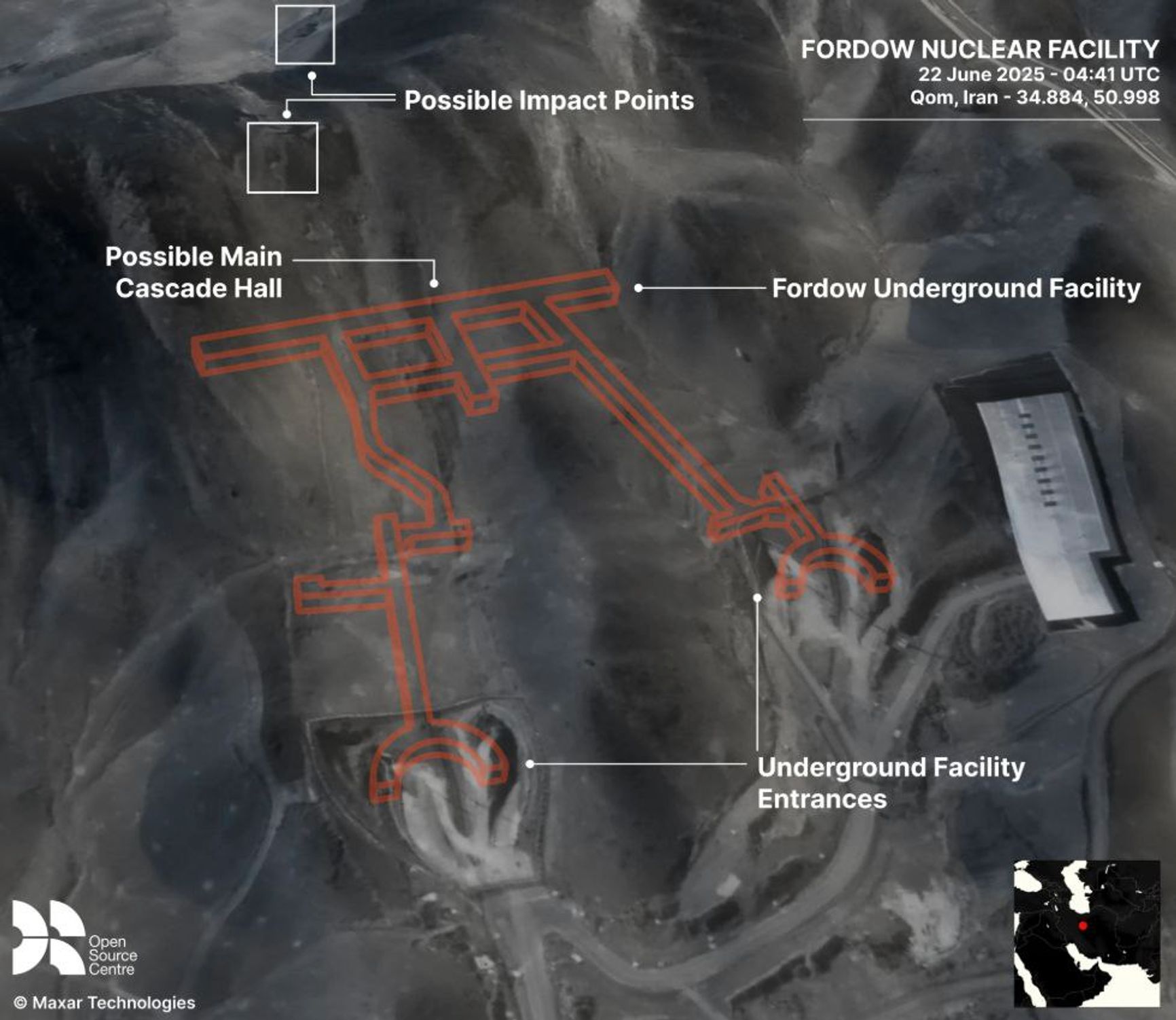Open Source Centre опубликовал созданную экспертами организации по топографическому плану трехмерную модель объекта. На изображении видно, на какие части объекта в Фордо пришлись удары. По мнению аналитиков, целью ударов был, вероятно, каскадный зал, в котором располагаются центрифуги для обогащения урана.
